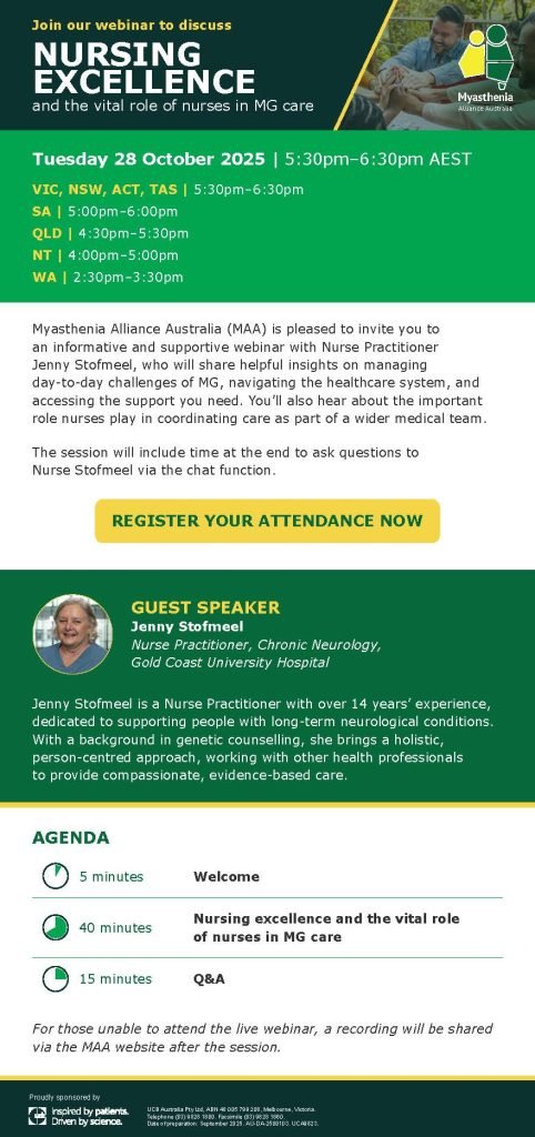 Myasthenia Alliance Australia (MAA) are delighted to invite you to an informative webinar with Nurse Practitioner Jenny Stofmeel.