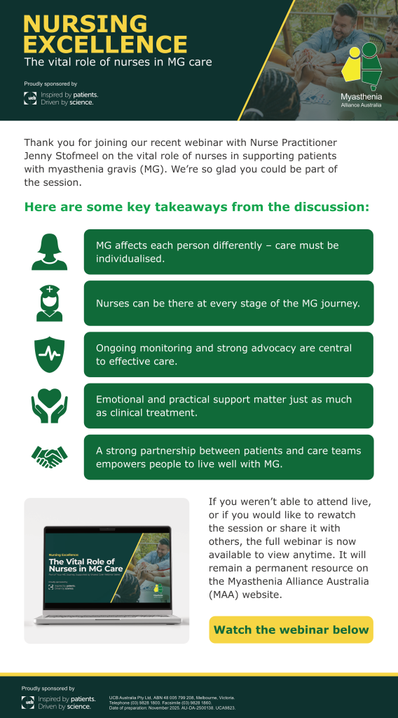 In this recent Nursing Excellence webinar, Nurse Practitioner Jenny Stofmeel shared valuable insights into how nurses can support individuals with MG through personalised care, ongoing monitoring, and strong patient partnerships. The session highlighted the importance of understanding each person’s experience and ensuring care extends beyond treatment to include emotional and practical support.