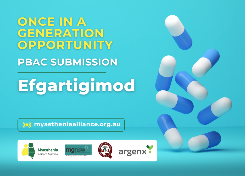 Who: Myasthenia patients (and their carers or families/friends) can make a consumer submission to contribute to the PBAC evaluation of Vyvgart® (efgartigimod alfa). PBAC is the regulatory body that recommends new medicines for listing on the Pharmaceutical Benefits Scheme (PBS) based on medical conditions, clinical effectiveness, safety, and cost-effectiveness.
