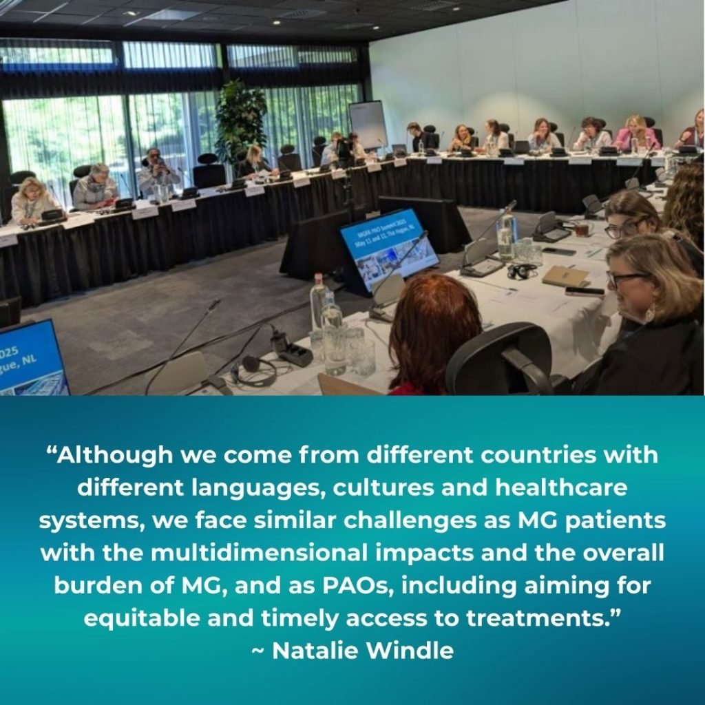 Although we come from different countries with different languages, cultures and healthcare systems, we face similar challenges as MG patients with the multidimensional impacts and the overall burden of MG, and as PAOs, including aiming for equitable and timely access to treatments. Like us in Australia, many of the patient organisations in Europe are also run by patients for patients, and the work we do is making a positive difference for MG patients.