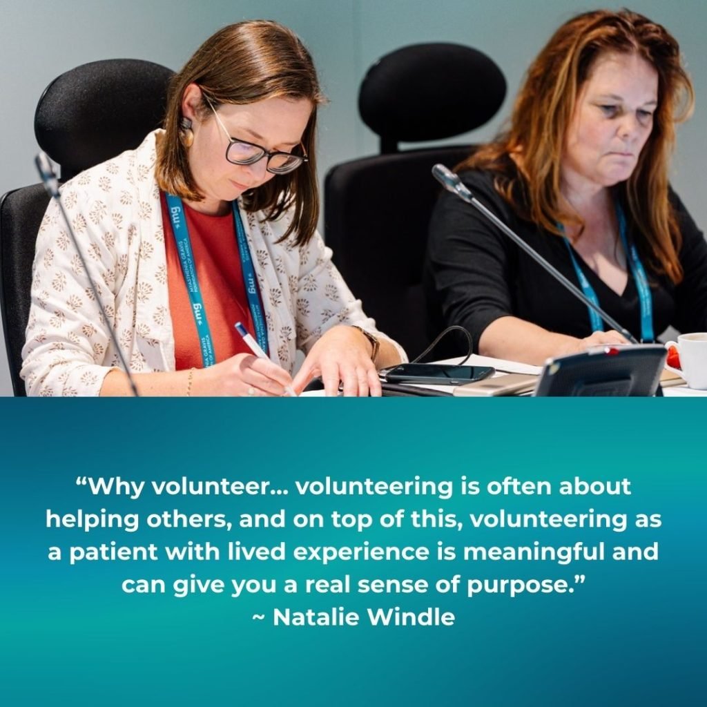 Why volunteer… volunteering is often about helping others, and on top of this, volunteering as a patient with lived experience is meaningful and can give you a real sense of purpose.